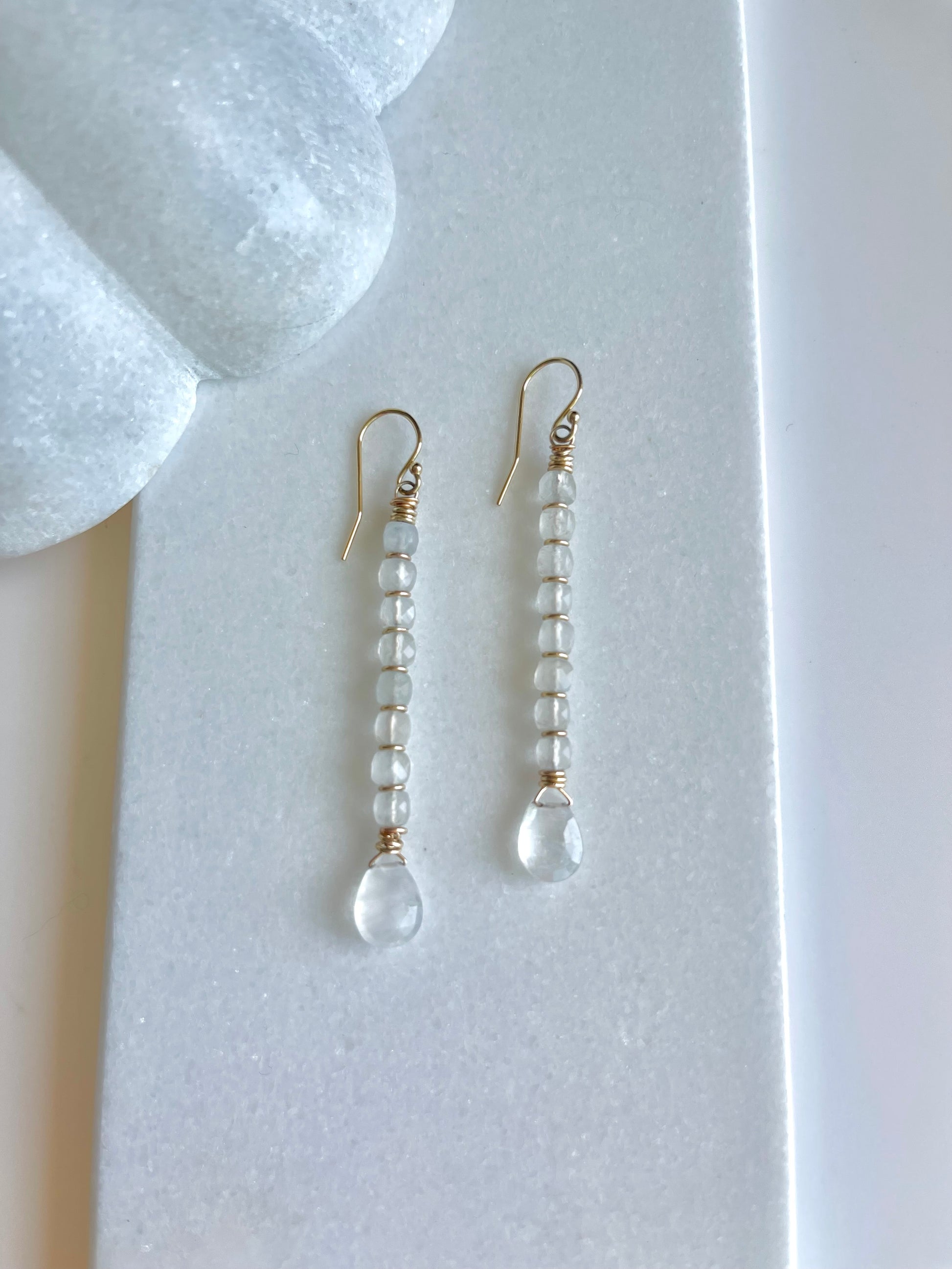 These earrings are so versatile! Wear them on your big day, but don’t forget to bring them with you on your honeymoon. Faceted cube moonstones dangle with a teardrop milky moonstone on bottom. 2 inches in length.