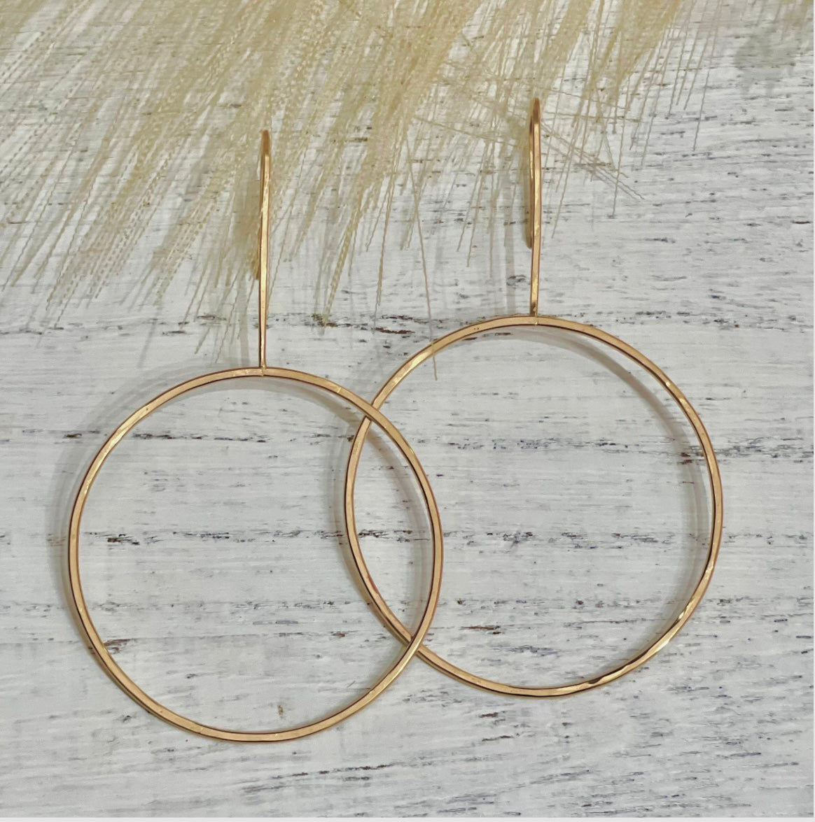Large hand formed and hammered circles with long earhook made with 14k gold filled wire. These hoops hang 2 1/2" in length.