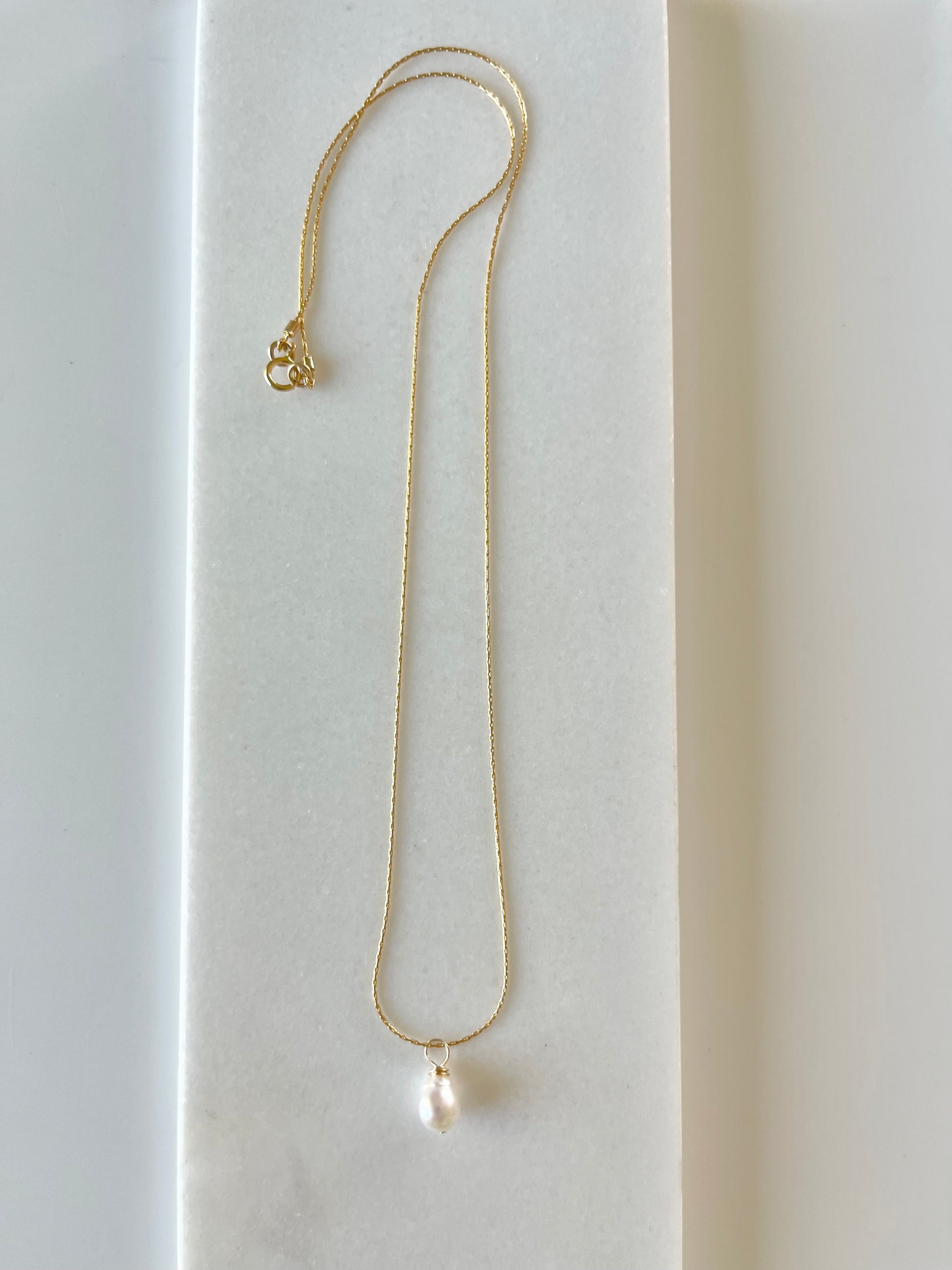 Simple yet sophisticated! A freshwater pearl charm moves throughout this skinny 14k gold fill cordette chain.