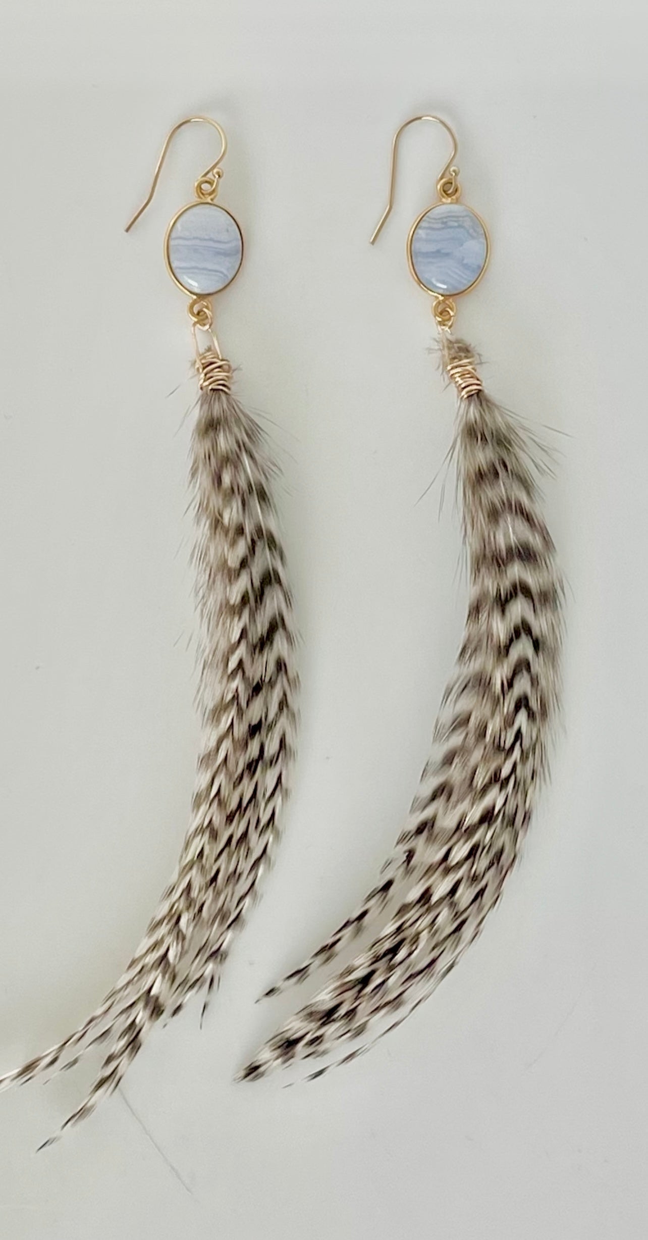 These fun feather earrings are a must-have for any fun concert event! Grizzly hackle feathers are wire wrapped and dangle from blue lace agate stone. 4 inches in length.
