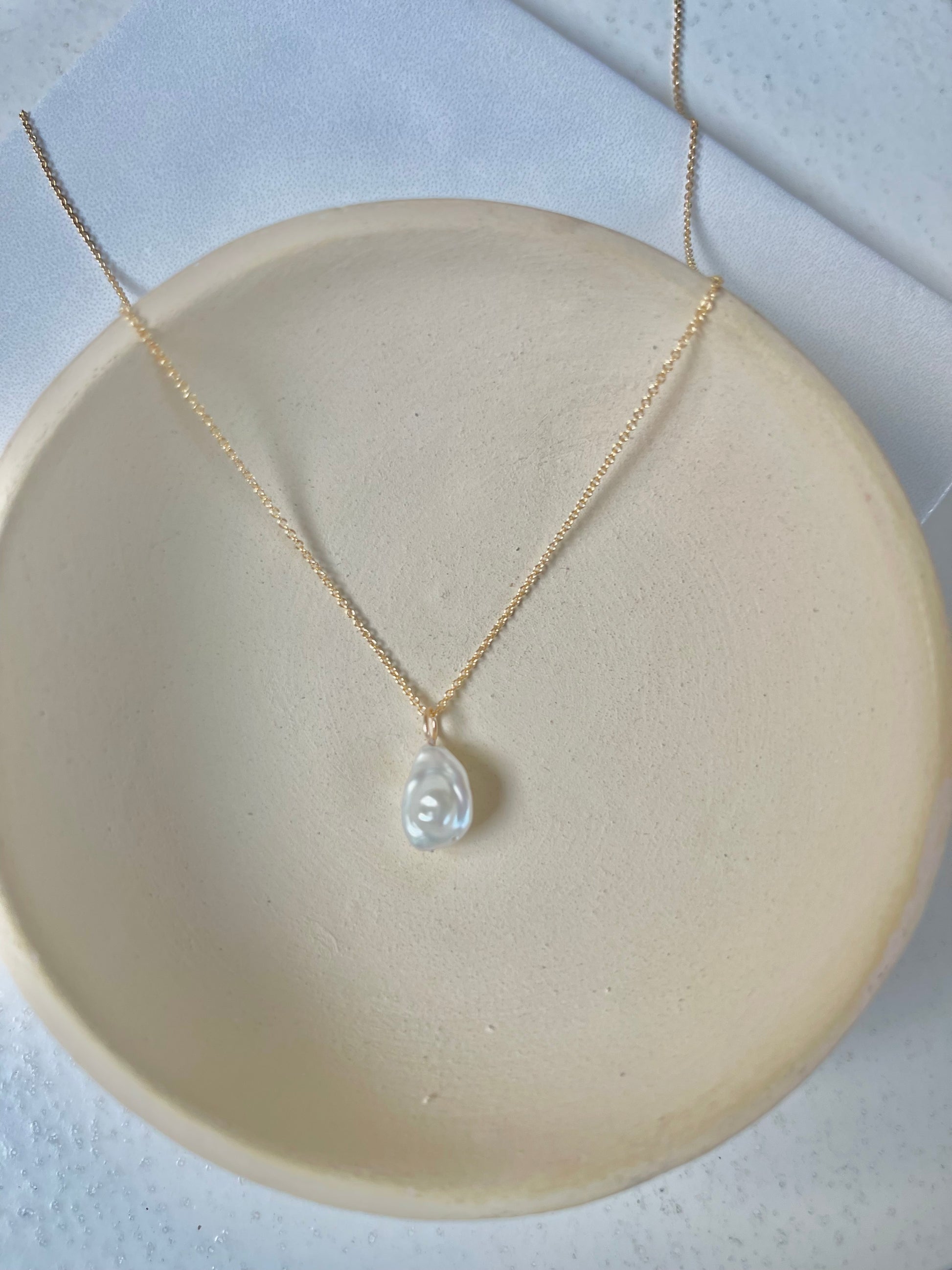 7mm baroque pearl dangles from a dainty 14K gold-filled chain.