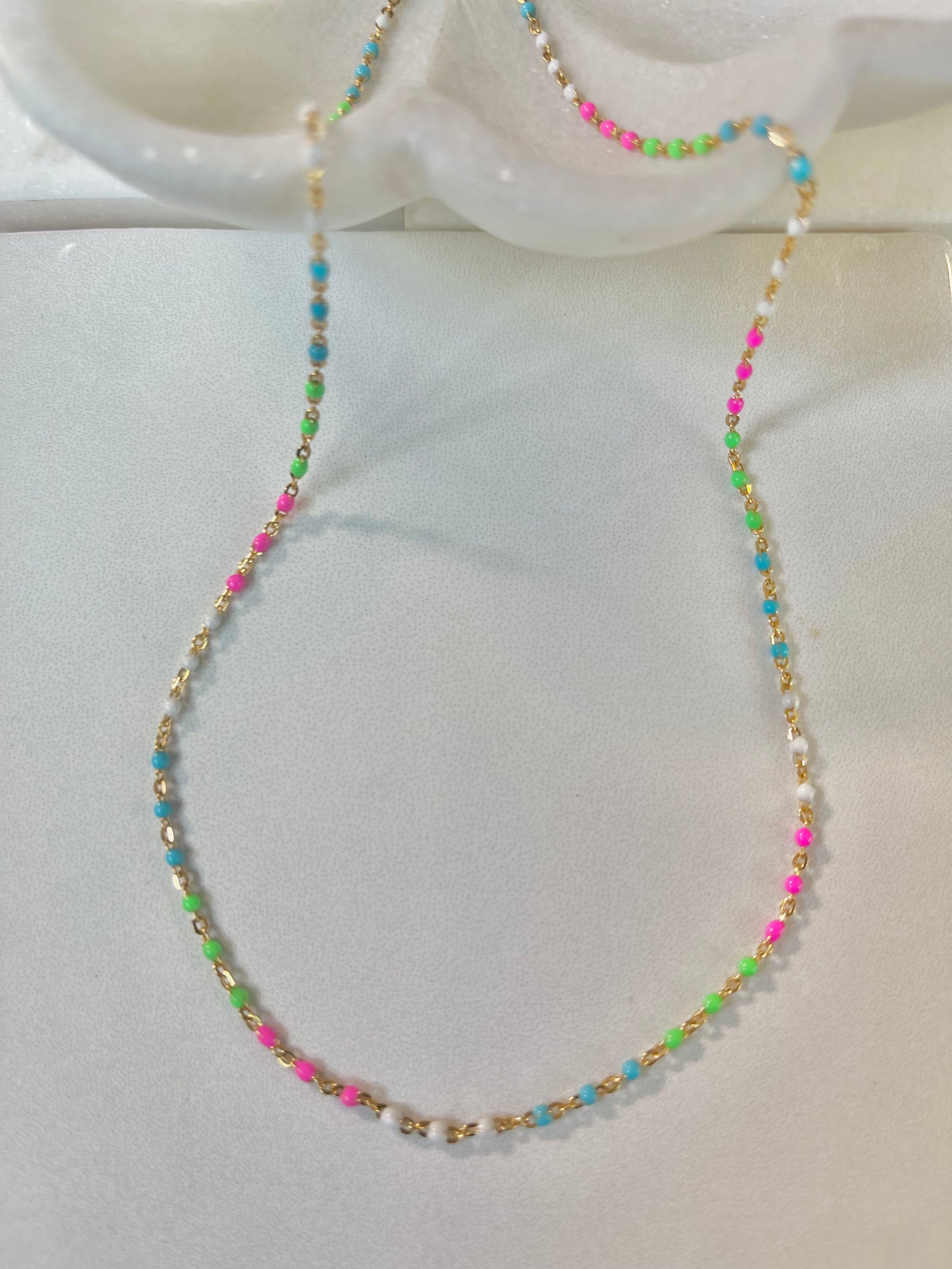 This piece is named after my spunky daughter! It's a 14k gold fill chain with Neon pink, white, blue, and green enamel beads.
