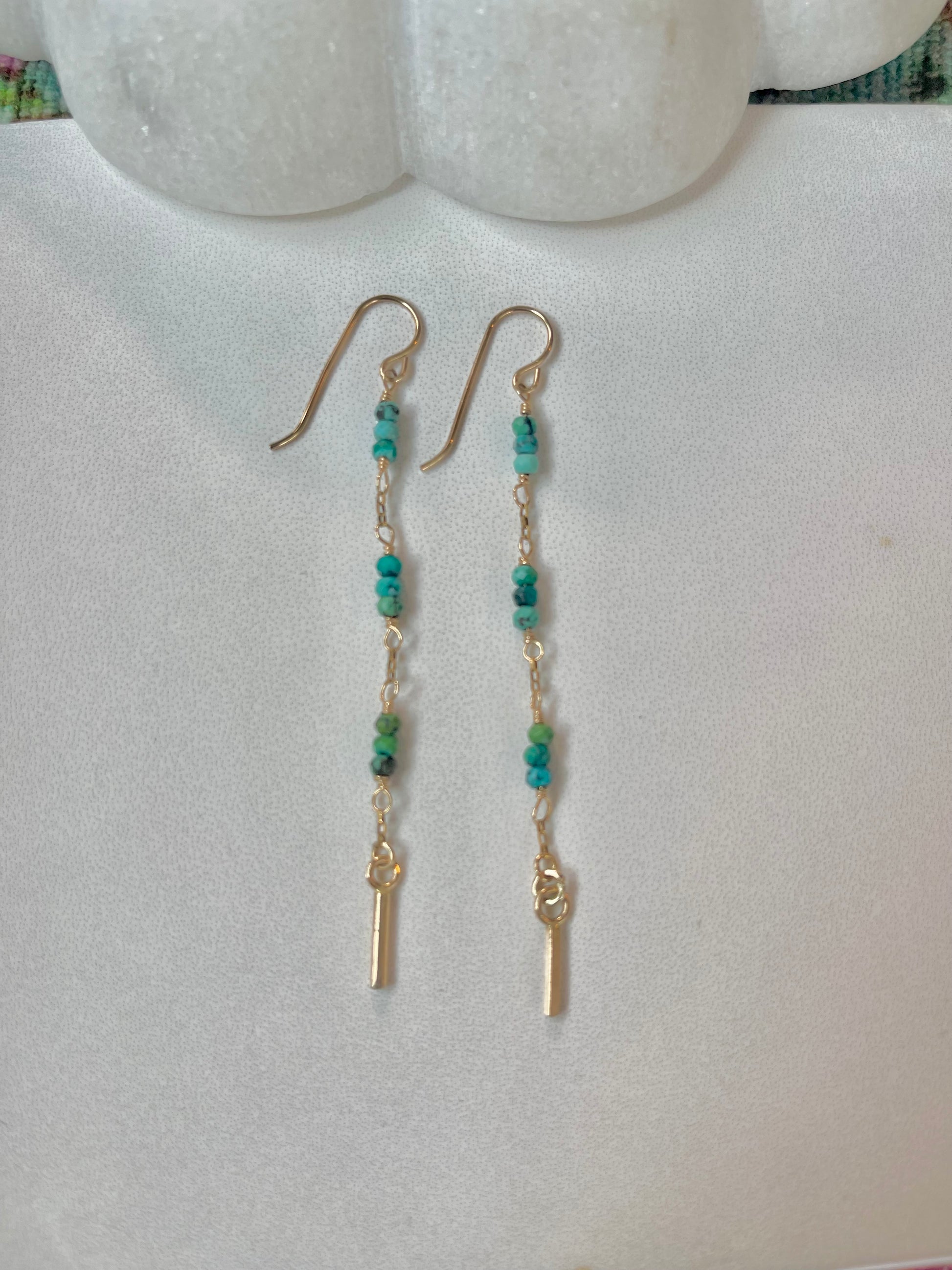 Tiny turquoise wire wrapped throughout chain with gold sticks that swing from the bottom of earrings. 2 1/2 inches in length.