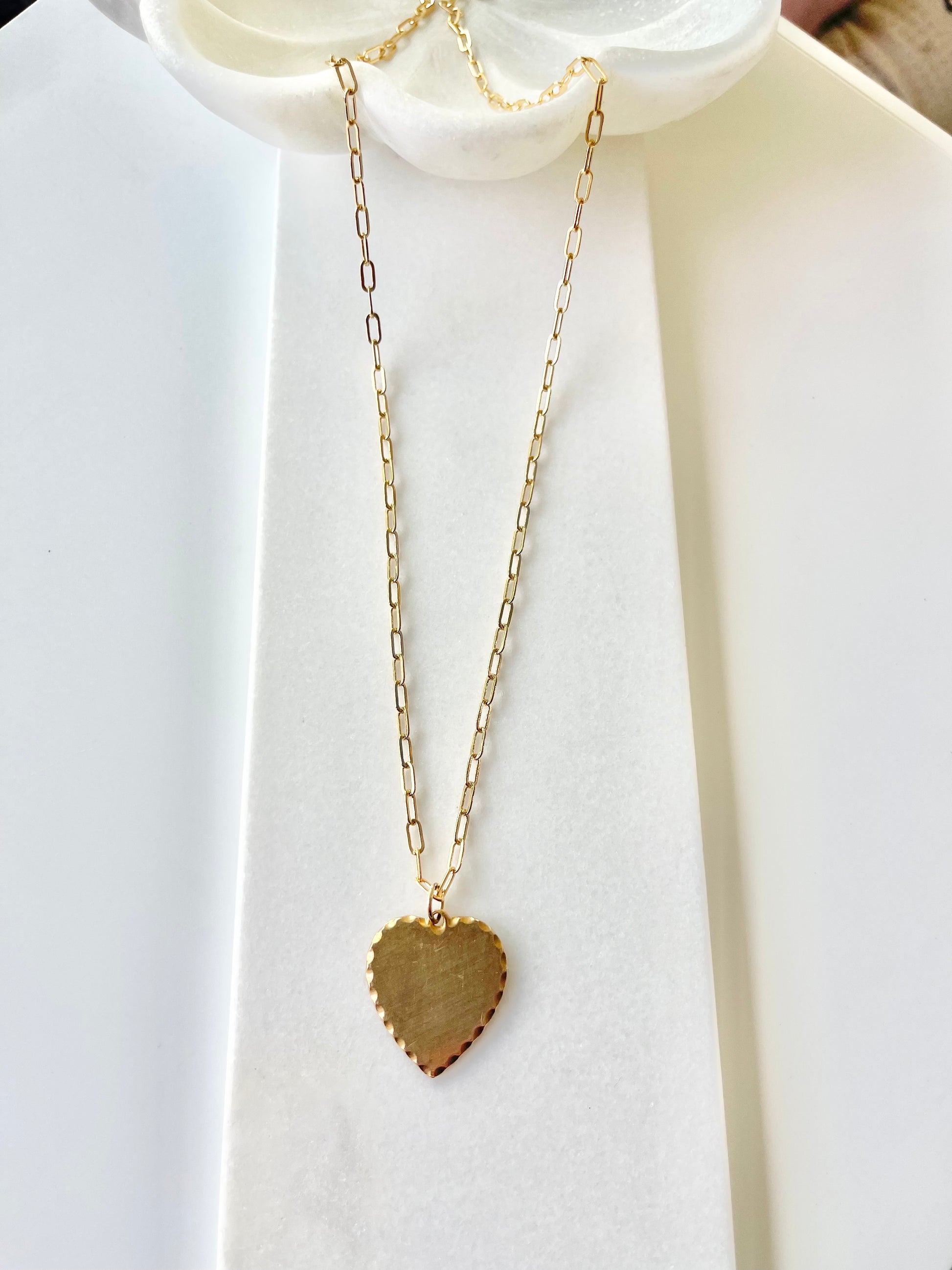 A vintage brass heart charm dangles from a 14k gold fill thick paperclip chain. Perfect to wear alone or layer with multiple necklaces.