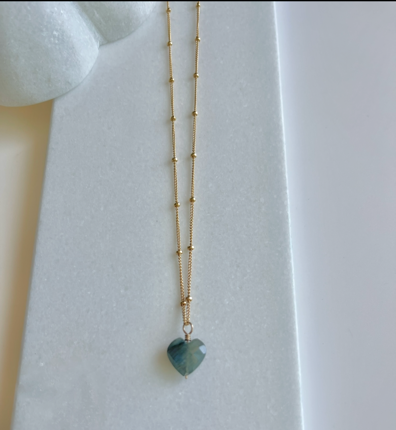 This piece features a Labradorite-shaped heart charm that dangles from a 14k gold fill ball chain.