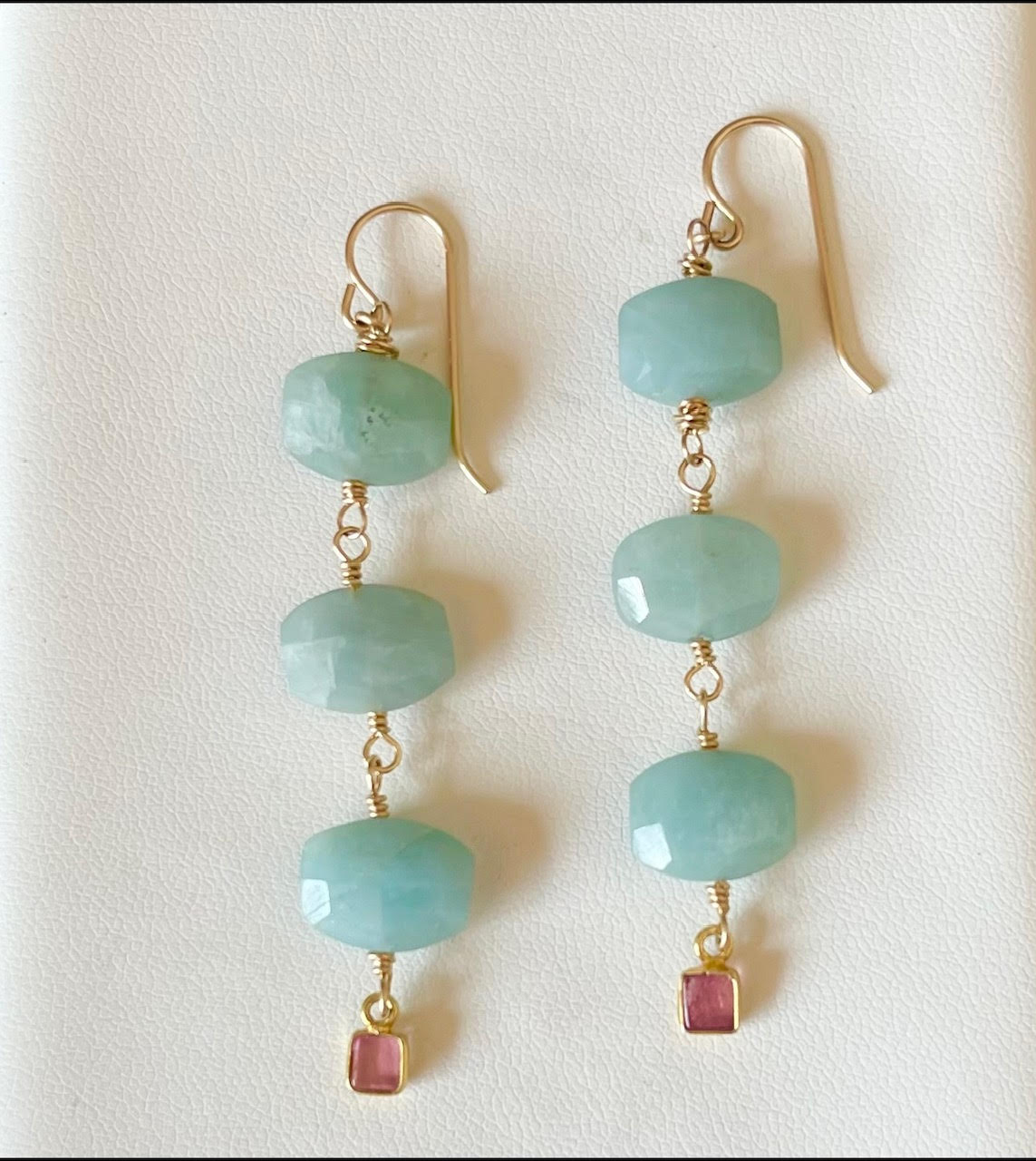 Three beautiful aquamarine rectangular stones are wire wrapped with a deep pink tourmaline drop. Perfect for any occasion. 2 1/2 inches in length.