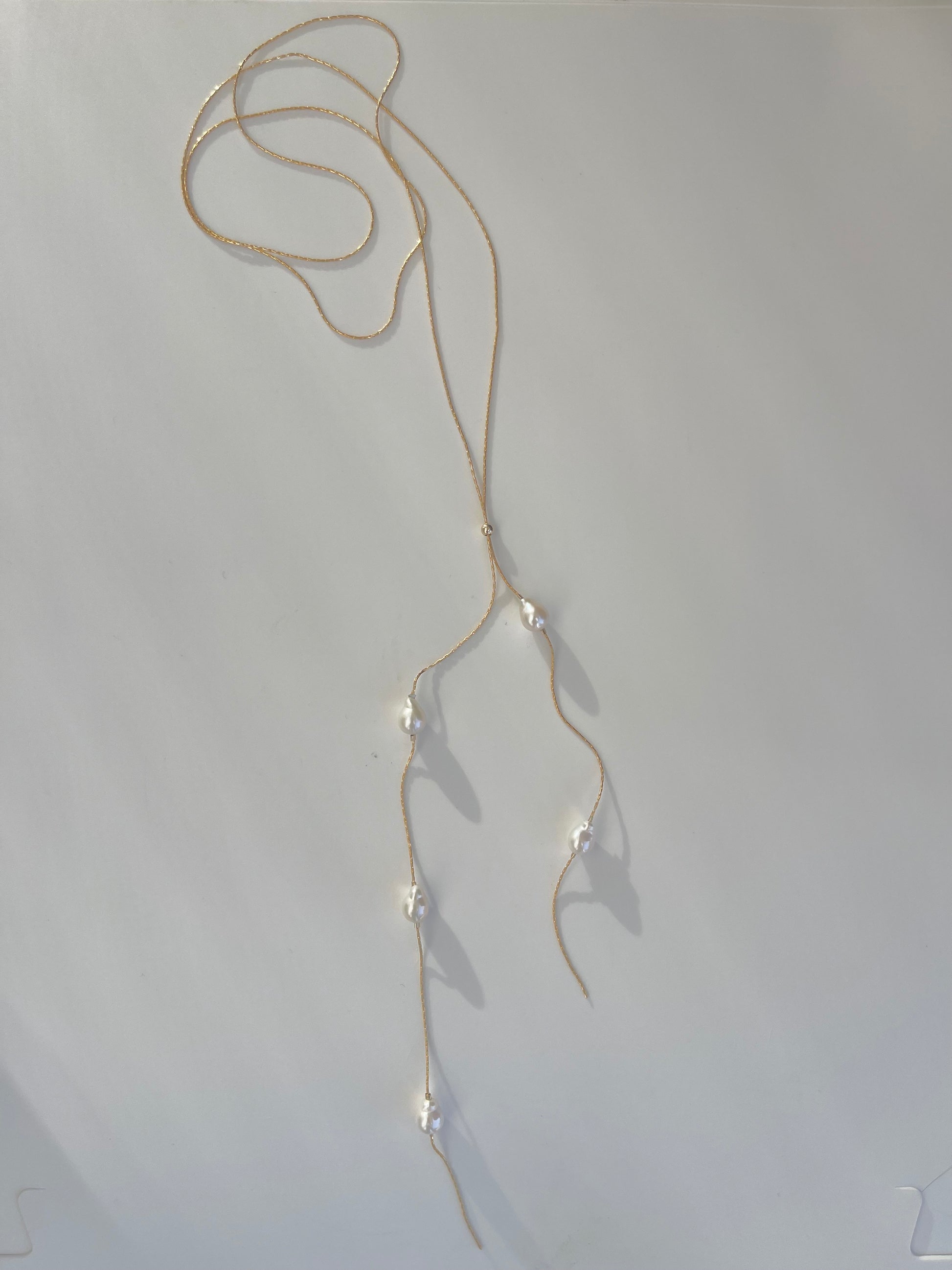 This necklace was inspired and worn by my beautiful niece on her wedding day. Lovely Baroque pearls float throughout a 14k gold fill cordette chain. This necklace is bolo style that can be worn in front or down the back without a clasp. 34" in length.