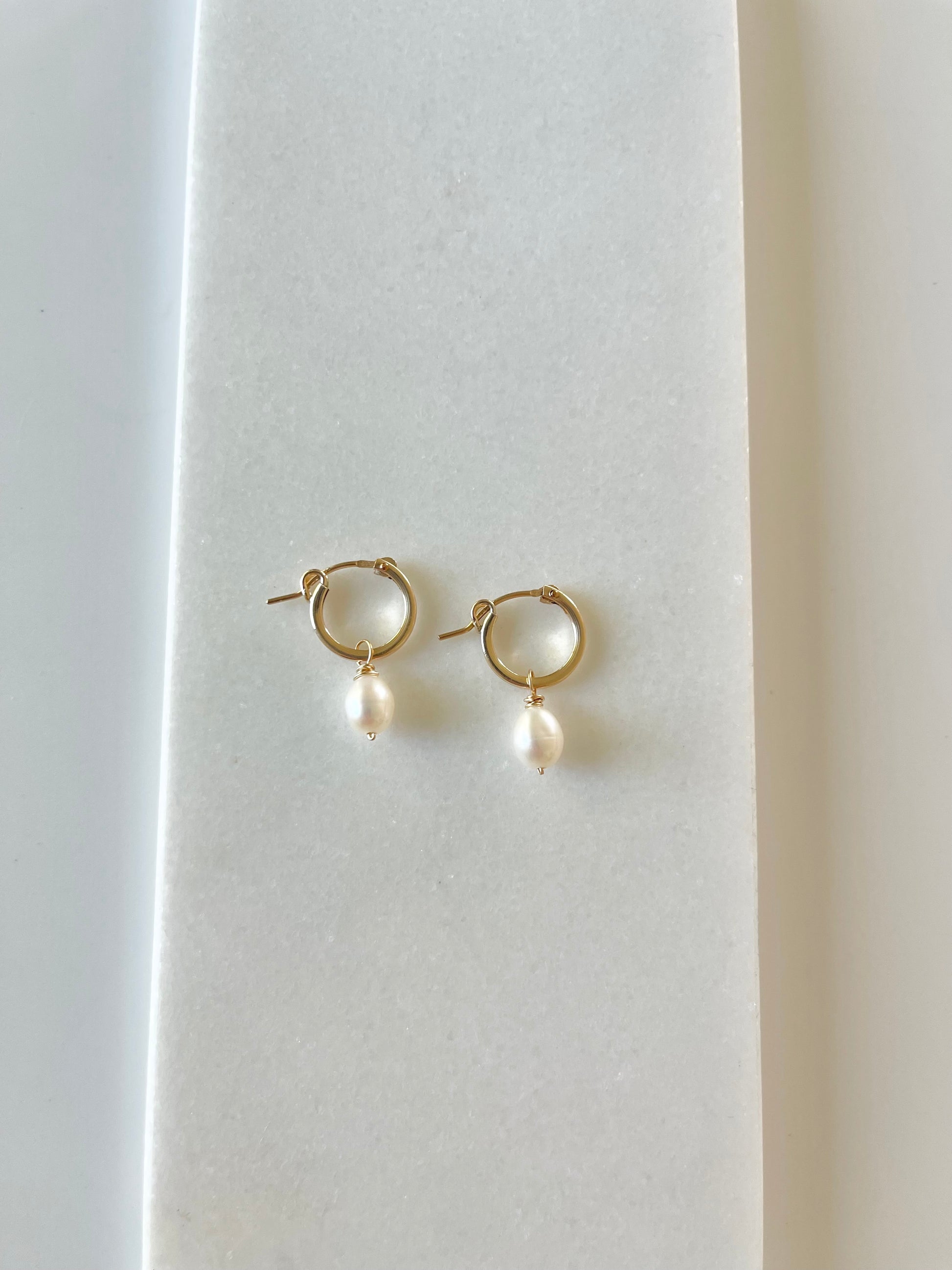 A dainty freshwater pearl dangles from a 14k gold fill 12mm huggie hoop. The pearl can also be removed to just wear the hoop. Two fantastic looks in one! 1 inch in length.